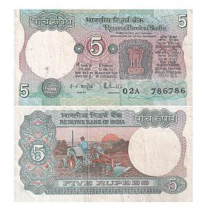 India Reserve Bank of India signed by R.N. Malhotra Tractor Series ND inset A fancy number 786786 5 Rupees