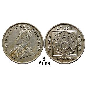 British India George V 1919 AD no dot Calcutta Mint Cupro-Nickel 8 Annas