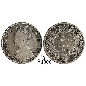 British India Victoria Empress 1881 AD Calcutta Mint Obv A Rev I C Incuse Silver 1/2 Rupee