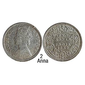 British India Victoria Empress 1883 AD Bombay Mint Obv A Rev I dot Silver 2 Annas