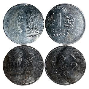 Republic India Set of 2 Coins Side Shifting Error Double Side Error Noida Mint 1999 AD Error Side Diversion Stainless Steel 2 Rupees 1 Rupee