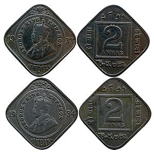 British India George V 1933 AD 1934 AD Set of 2 Coins Cupro-Nickel 2 Annas